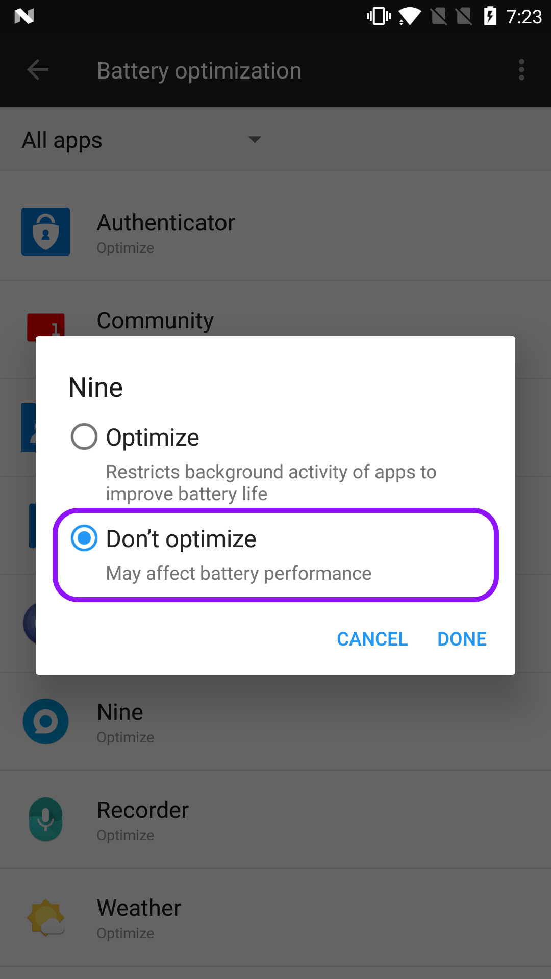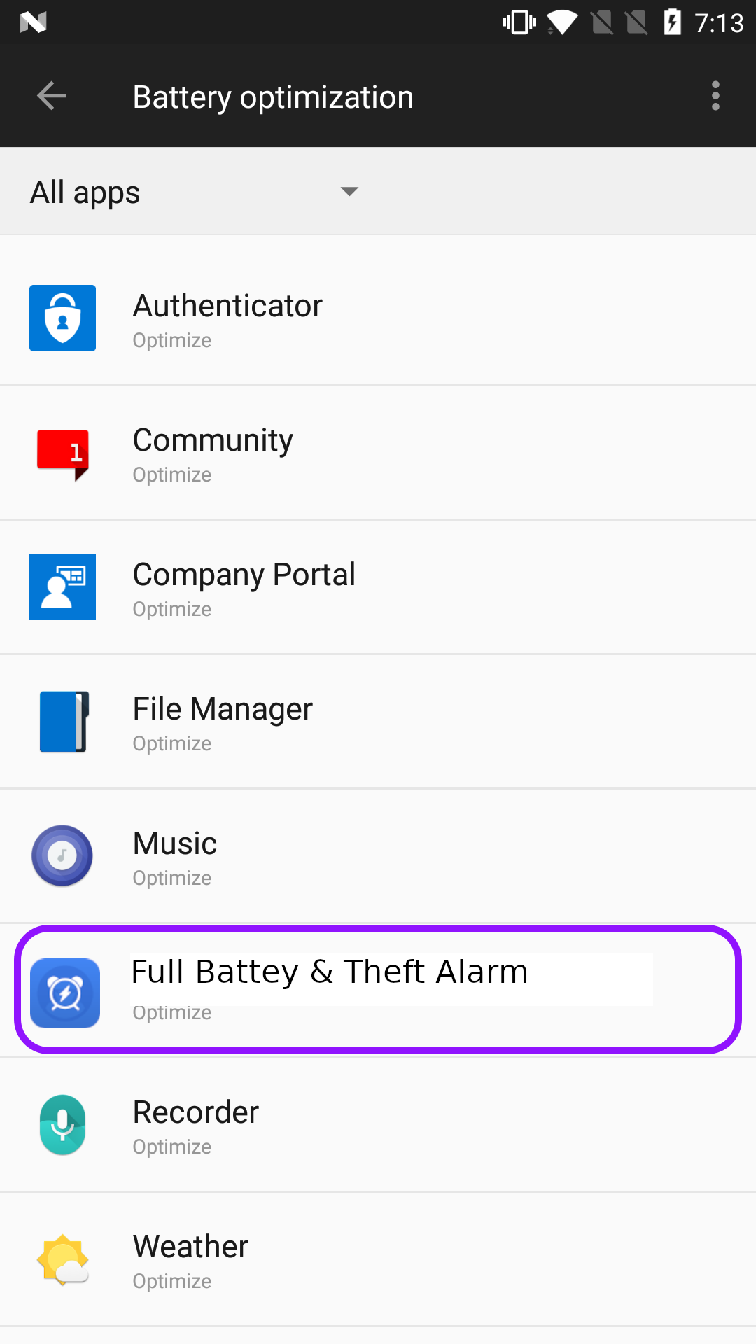 3. On the Battery optimization screen, switch to the All apps list from the drop-down to see all of the apps on your device. Tap Full Battery & Theft Alarm from the menu and choose Don’t optimize to exclude Full Battery & Theft Alarm from the Doze feature. Please note that Full Battery & Theft Alarm is no longer affected from Doze feature.