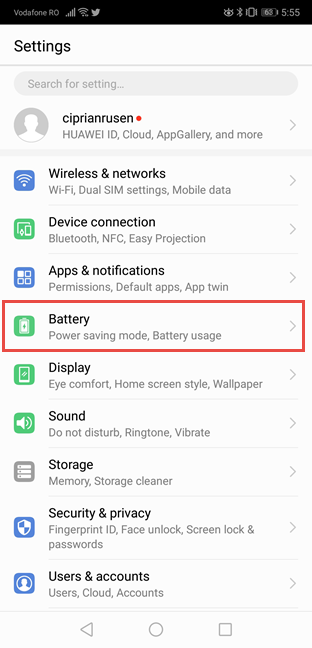 Unlock your Huawei smartphone, and go to its Settings app. Then, tap the Battery category of settings.