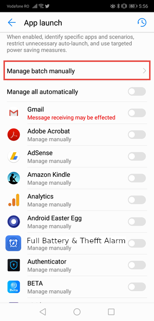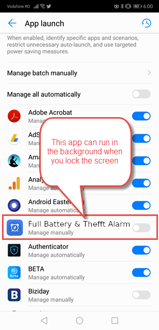 This means that your Huawei smartphone is free to force-close any of your apps, as it sees fit, according to its algorithms, each time you lock the screen. Find the first app that you want to configure, and turn off its switch to "Manage manually." You immediately see a prompt where you are asked what kind of activities you want to allow the app to perform: