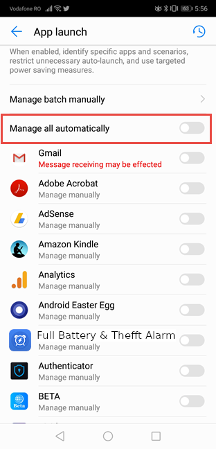 To eliminate all issues, it is a good idea to allow the app to perform all three types of activities, and tap OK. Find all the apps which you want to run in the background, and repeat the same settings. As you do this, notice that they have their switches turned off, and beneath their name, you see the text "Manage manually." This is good, as it means that Huawei stops killing them each time you lock the screen on your smartphone.