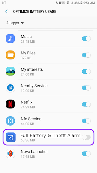 5. On the Optimize Battery Usage screen, switch to the All apps list from the drop-down to see all of the apps on your device. Turn off to exclude Full Battery & Theft Alarm from the Doze feature. Please note that Full Battery & Theft Alarm is no longer affected from Doze feature.