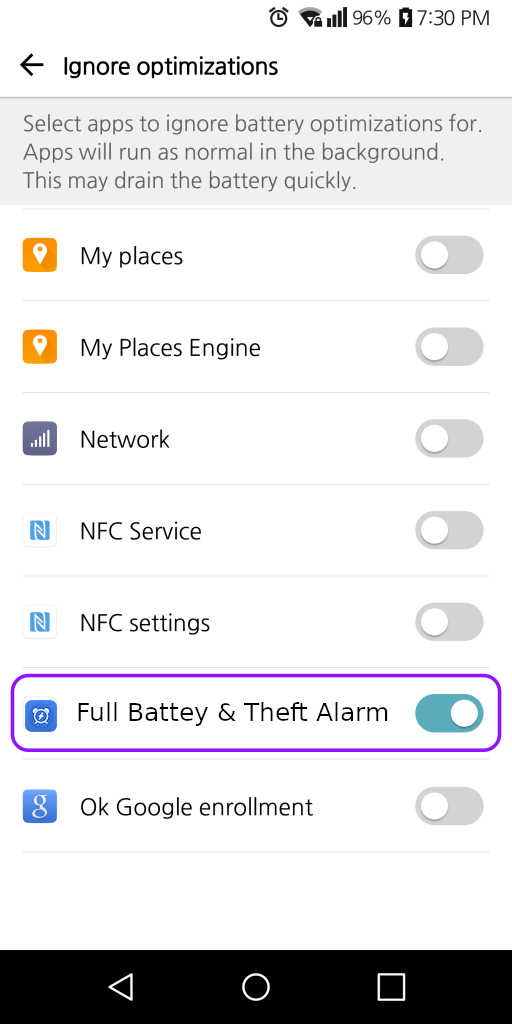 4. Turn on to exclude Full Battery & Theft Alarm from the Doze feature.